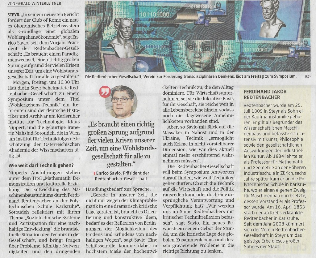In diesem Sinne wird die Redtenbacher Gesellschaft anlässlich des 160. Todesjahres des Steyrer Pioniers F. J. Redtenbacher eine Festveranstaltung mit zwei Vorträgen anbieten. Dieses Symposium wird sich – insbesondere auch aus neuestem historischem Wissen über den Professor für Maschinenbau – mit kritischer Technikreflexion befassen. In Anlehnung an den Club of Rome, der im aktuellen Bericht von einer unumgänglichen „Wohlergehensökonomie“ spricht, soll diesbezüglich auf die Rolle der Technik eingegangen werden. Wie könnte das neue Bewusstsein dieser Spezialisten formuliert werden, das notwendig wäre, um die kritische Lage des globalen Zusammenlebens und dessen gravierende Probleme in die richtige Richtung zu führen. Die gegenwärtige (Welt)Wirtschaft beruht wesentlich auch auf technischen Entwicklungen. Wie damit umgehen, war nicht nur schon Redtenbachers Sorge, sondern sollte es wohl heute umso mehr sein. Um diese Thematik kompetent zu diskutieren, konnten wir zwei sehr interessante Referent/innen gewinnen.