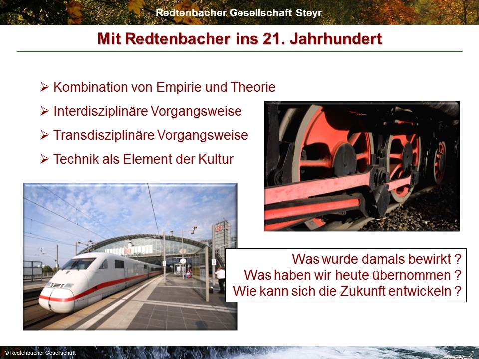 Schon 2008 formierte sich die Redtenbacher Gesellschaft, um zum 200. Geburtstag von Ferdinand Redtenbacher, dem berühmten Steyrer Pionier, ein Symposium zu veranstalten. Der Eintrag in das Vereinsregister erfolgte 2010.