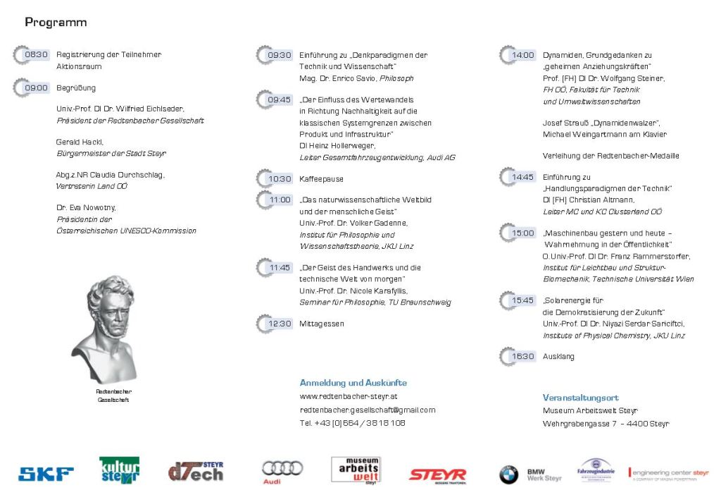 In diesem Sinne wird die Redtenbacher Gesellschaft anlässlich des 160. Todesjahres des Steyrer Pioniers F. J. Redtenbacher eine Festveranstaltung mit zwei Vorträgen anbieten. Dieses Symposium wird sich – insbesondere auch aus neuestem historischem Wissen über den Professor für Maschinenbau – mit kritischer Technikreflexion befassen. In Anlehnung an den Club of Rome, der im aktuellen Bericht von einer unumgänglichen „Wohlergehensökonomie“ spricht, soll diesbezüglich auf die Rolle der Technik eingegangen werden. Wie könnte das neue Bewusstsein dieser Spezialisten formuliert werden, das notwendig wäre, um die kritische Lage des globalen Zusammenlebens und dessen gravierende Probleme in die richtige Richtung zu führen. Die gegenwärtige (Welt)Wirtschaft beruht wesentlich auch auf technischen Entwicklungen. Wie damit umgehen, war nicht nur schon Redtenbachers Sorge, sondern sollte es wohl heute umso mehr sein. Um diese Thematik kompetent zu diskutieren, konnten wir zwei sehr interessante Referent/innen gewinnen.
